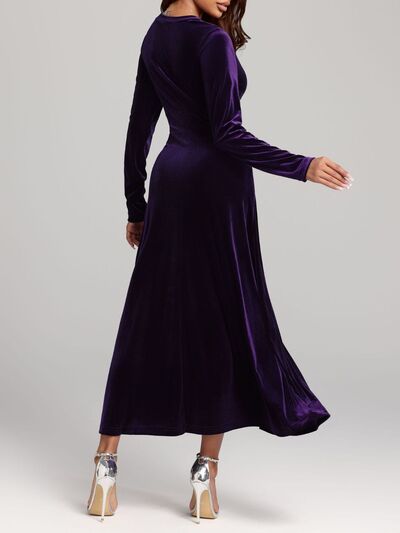 V-Neck Long Sleeve Tie Waist Midi Dress
