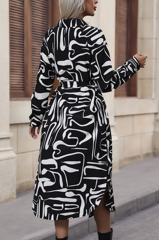 Printed Collared Neck Long Sleeve Dress