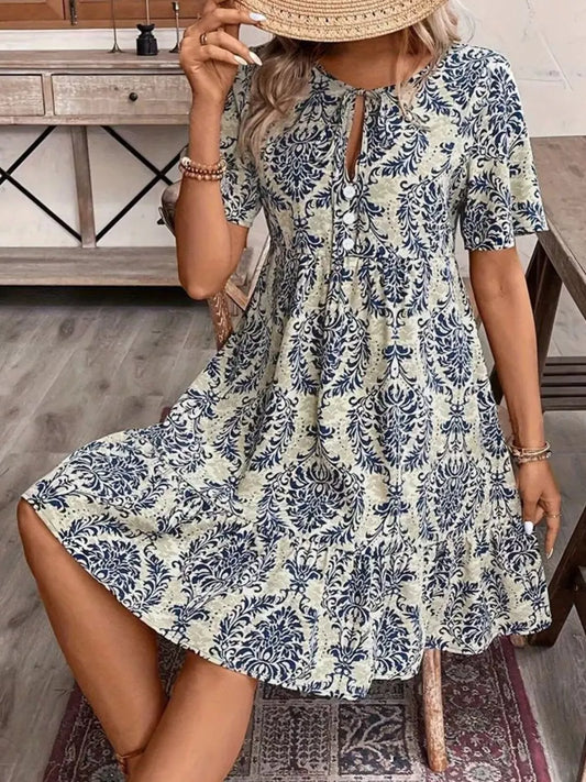 Printed Tie Neck Short Sleeve Mini Dress