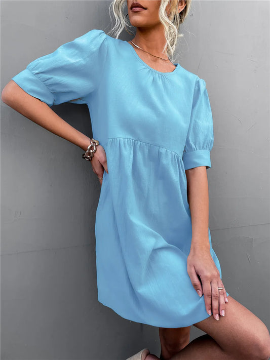 Corded Knit Textured Patched Pocket Frilled Swing Mini Dress with Pockets