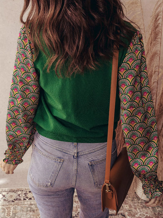 Floral Patchwork Shirred Cuff Puff Sleeve Knit Top