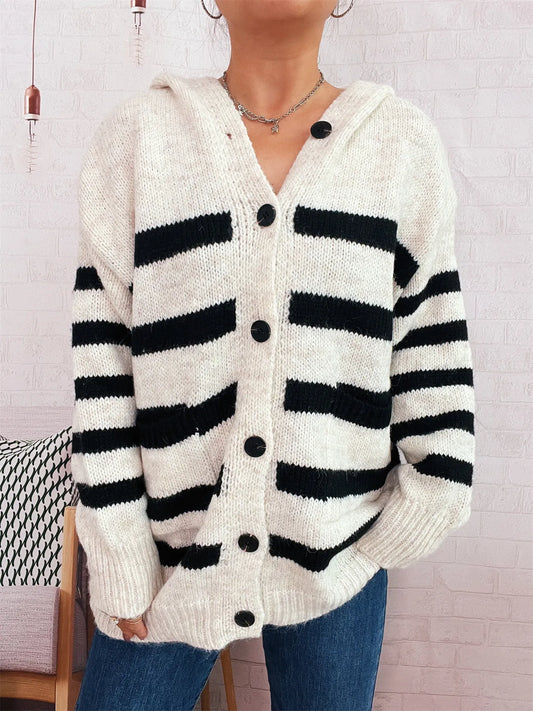 Striped Button-Up Hooded Cardigan