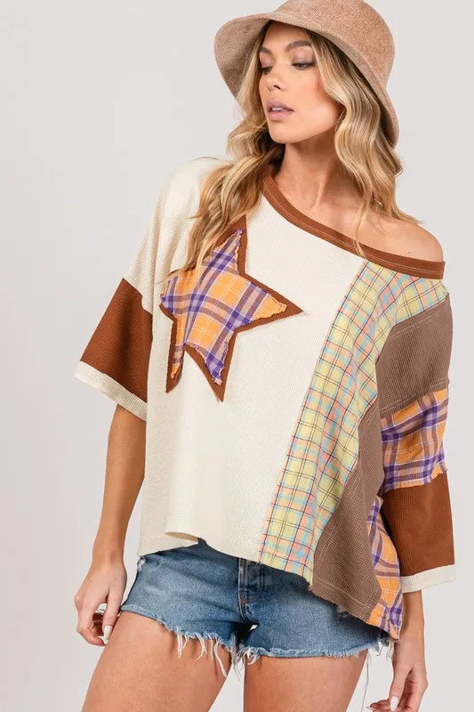 SAGE + FIG Plus Size Round Neck Plaid Star Patch T-Shirt