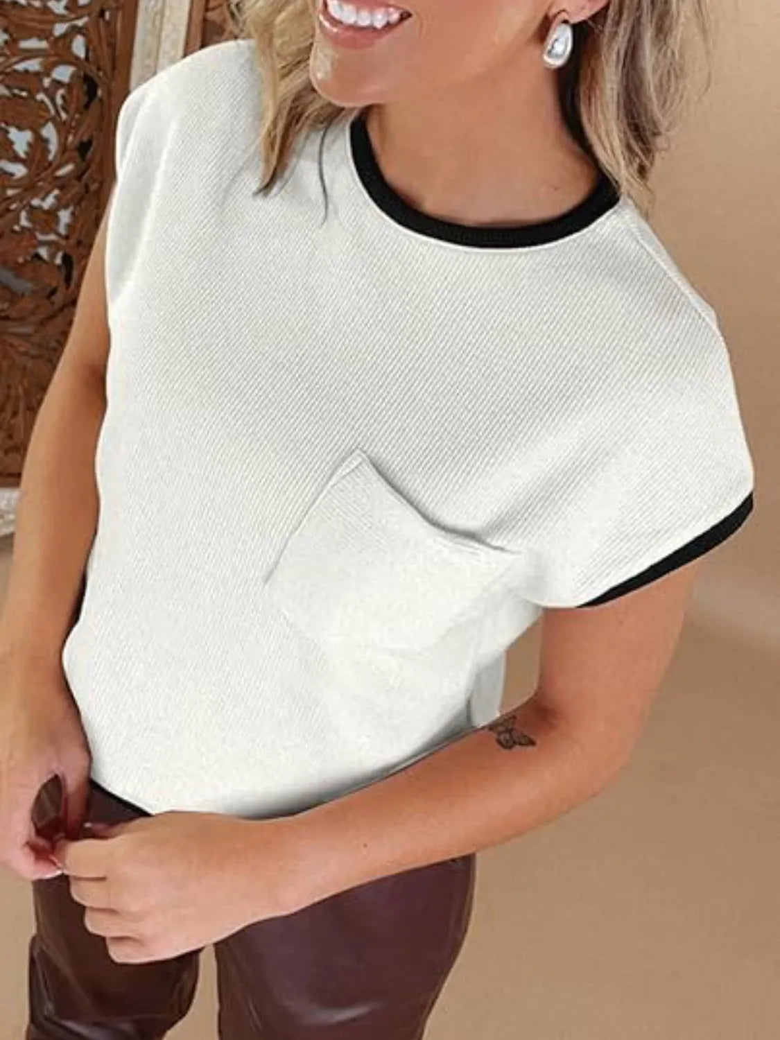 Contrast Trim Round Neck Cap Sleeve Top