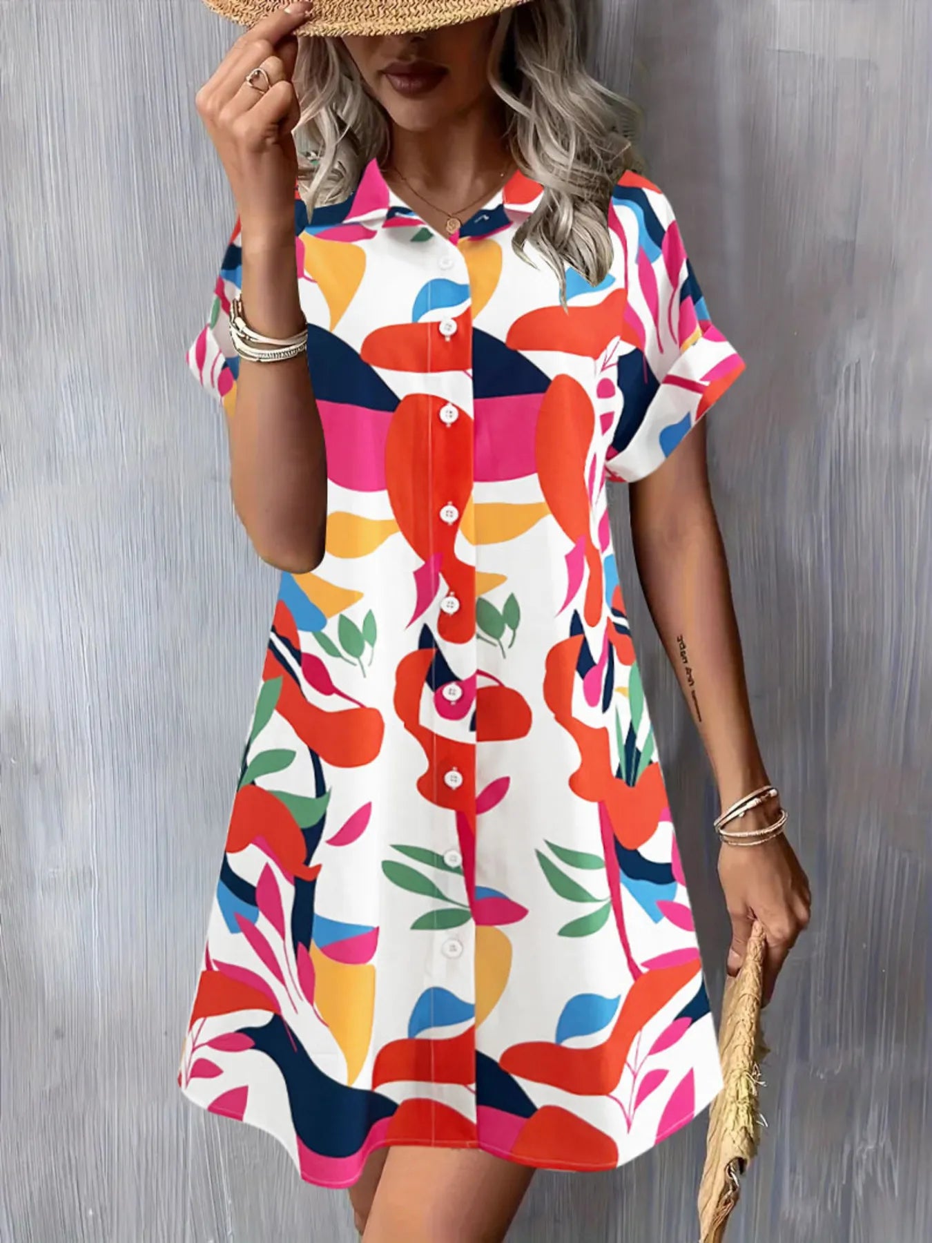 Printed Button Down Short Sleeve Dress