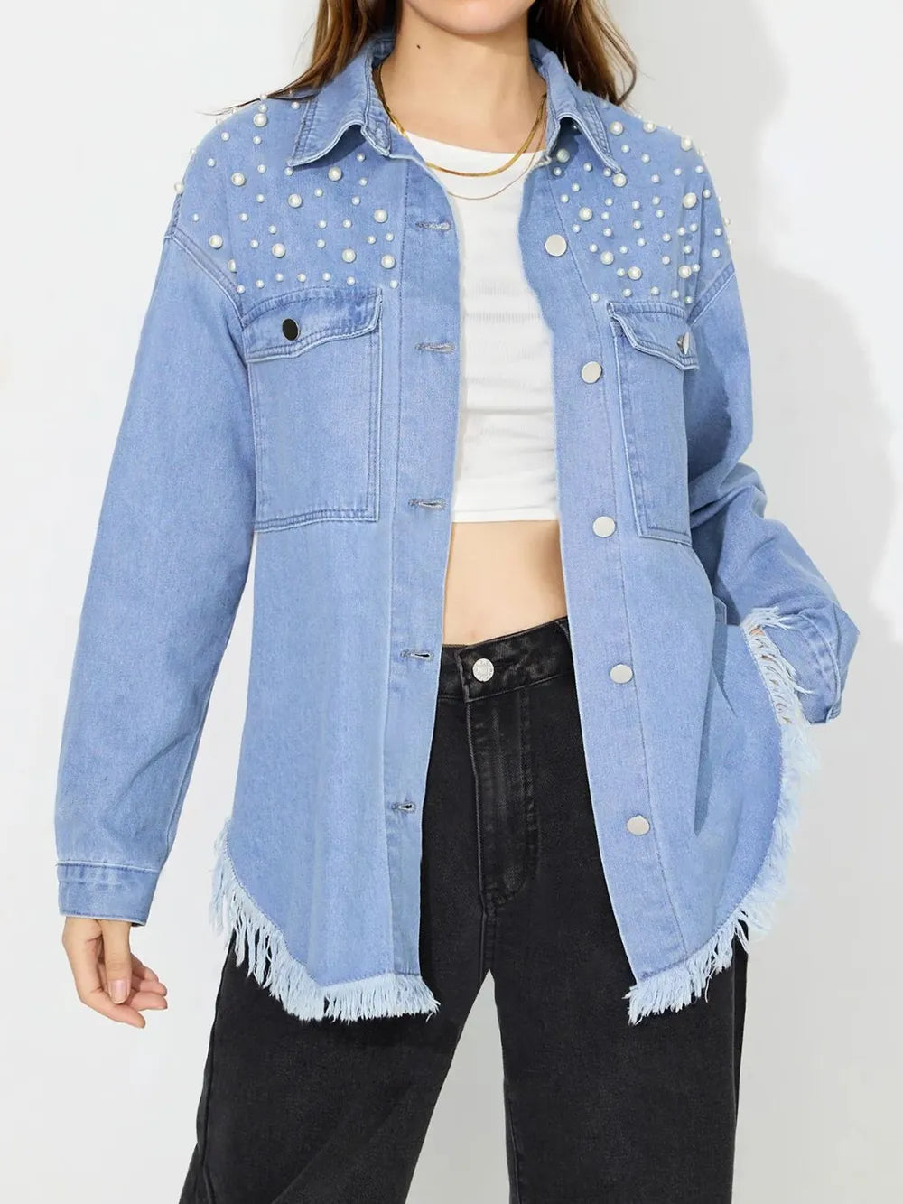 Raw Hem Pearl Trim Collared Neck Denim Top