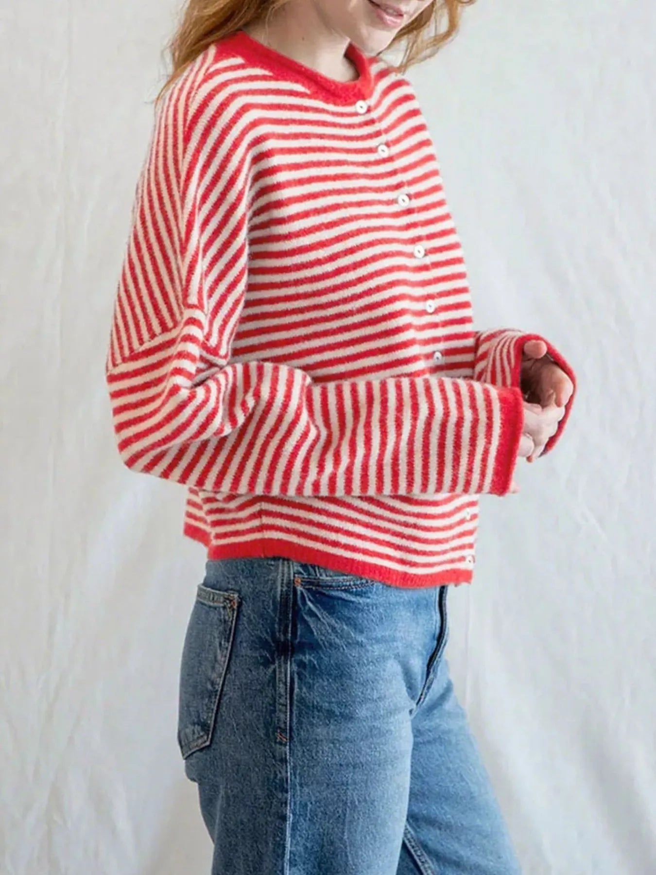 The Striped Button Front Long Sleeve Cardigan offers a flattering fit with its slightly stretchy fabric blend of 55% viscose, 23% polyester, and 27% nylon. Designed with buttoned closure and long sleeves, it provides both comfort and style. Easy to care for with machine wash cold and tumble dry low instructions, this imported cardigan is a practical and stylish layering piece for any wardrobe.